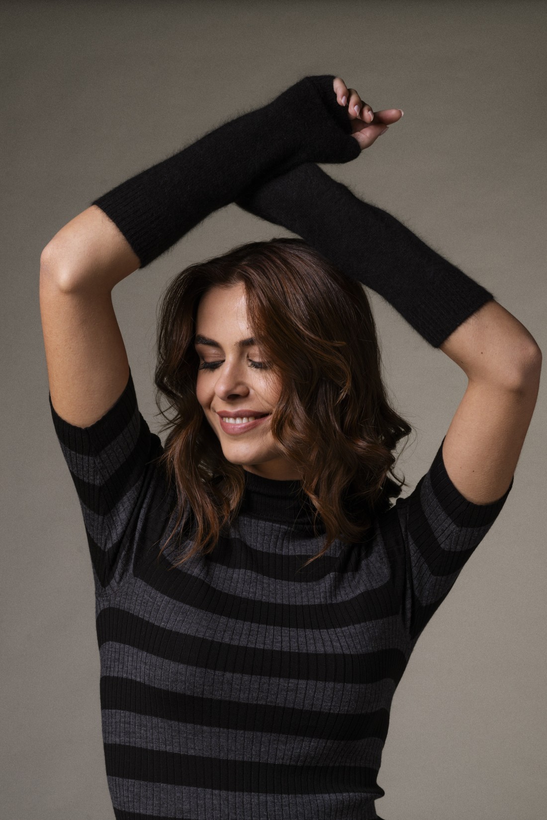 Manicotti in raccoon. La composizione in raccoon e nylon lo rende molto caldo, soffice e particolarmente morbido al tatto, perfetto sia per look eleganti che per look essenziali.