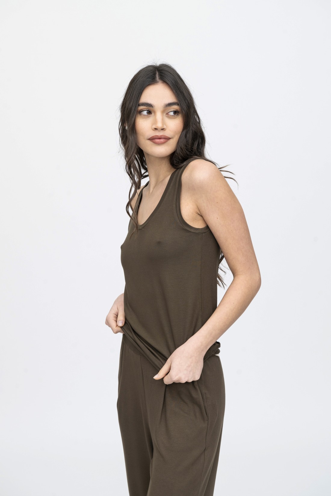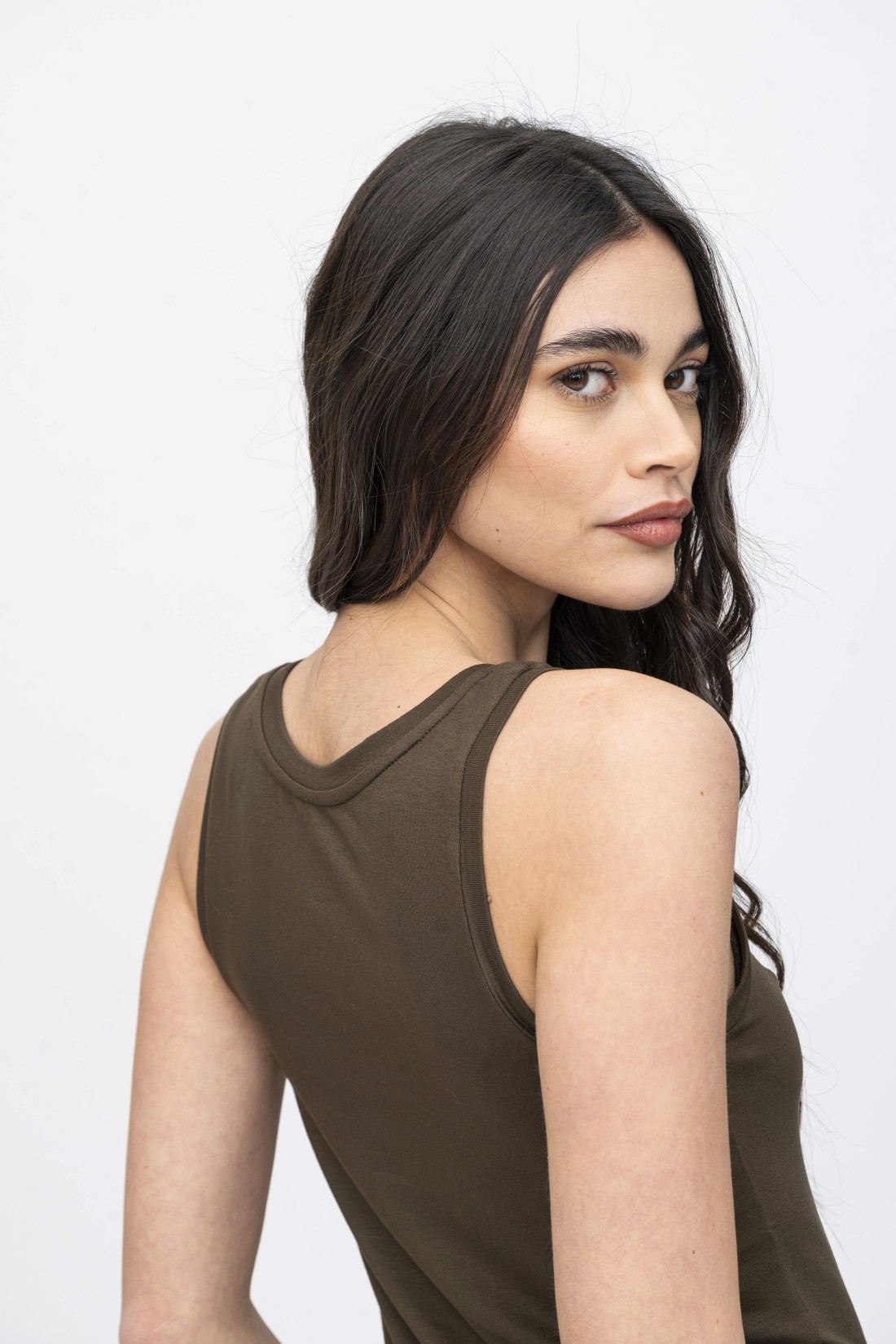 Canotta basica con scollo rotondo e vestibilità slim: un capo passepartout, semplice ed elegante. La composizione di viscosa ed elastan la rende particolarmente leggera e morbida al tatto, perfetta per essere abbinata ad altri capi oppure indossata da sola per un look essenziale.