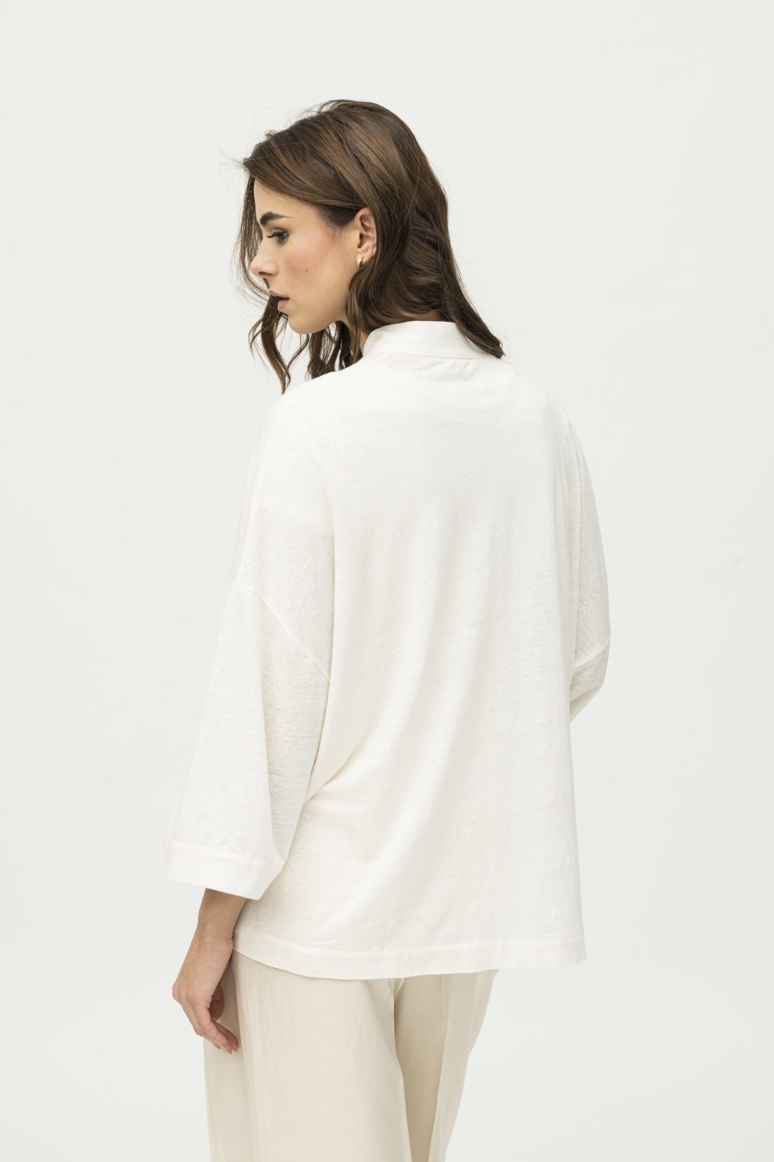 Un kimono è caratterizzato da una forma ampia, con maniche lunghe. Il kimono è noto per la sua simmetria ed eleganza. Il lino è un materiale naturale e fresco, quindi un kimono in lino è ideale per le stagioni più calde.