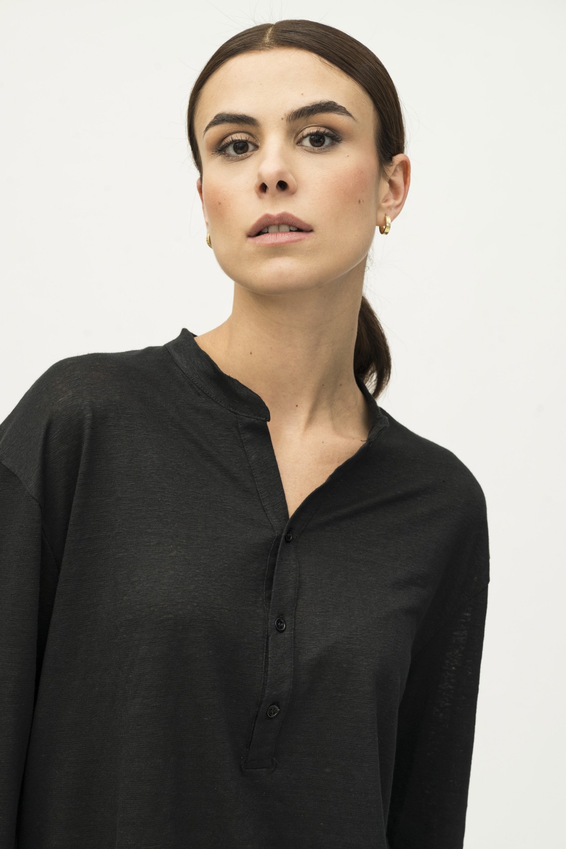 T-shirt da donna tunisien con scollo a serafino e bottoncini, maniche a 3/4. Leggera e versatile, è ideale per un look casual e raffinato, perfetta per la mezza stagione.