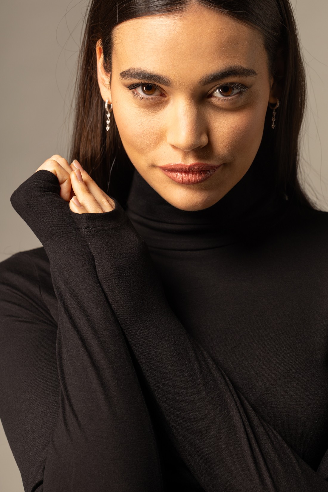 T-shirt dolcevita con manica lunga e vestibilità slim: un capo passepartout, semplice ed elegante. La composizione di viscosa ed elastan la rende particolarmente avvolgente e morbida al tatto, perfetta per essere abbinata ad altri capi oppure indossata da sola per un look essenziale.