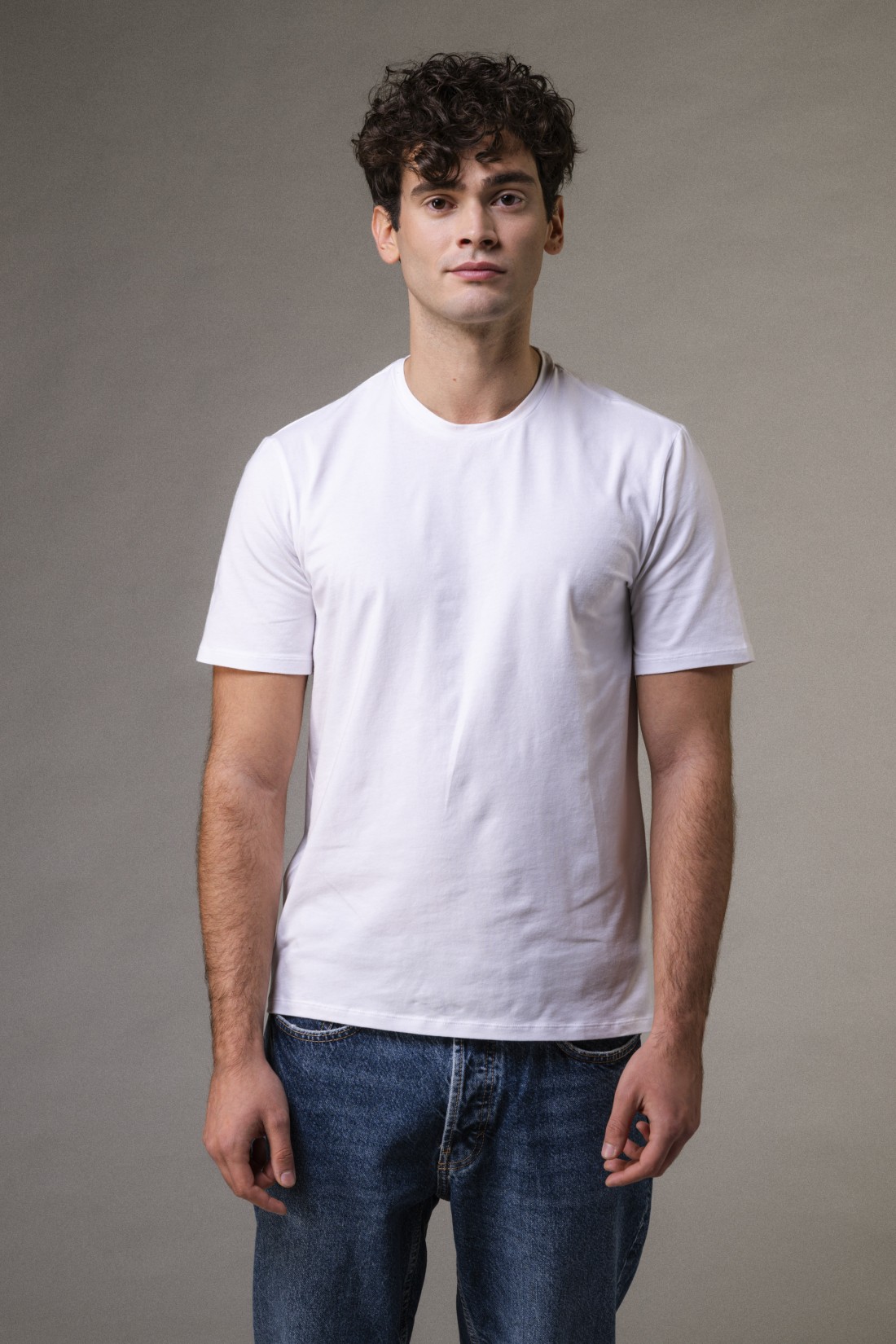 T-shirt basica girocollo con manica corta e vestibilità slim: un capo passepartout semplice e versatile. La composizione di cotone ed elastan la rende particolarmente leggera e morbida al tatto, perfetta per essere abbinata ad altri capi oppure indossata da sola per un look essenziale.