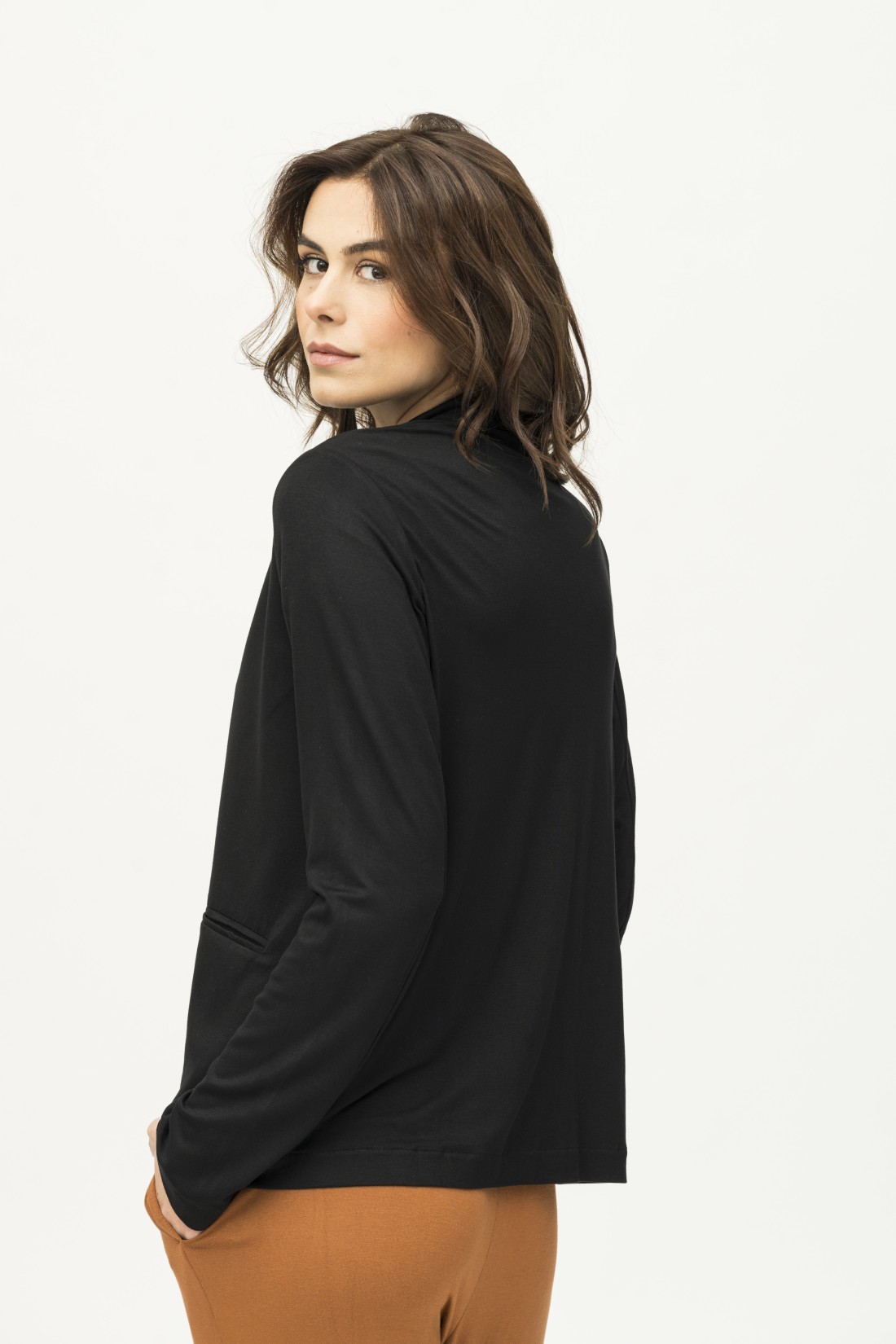 Giacca con manica lunga, colletto e tasche a filetto: un capo versatile e femminile a vestibilità over. La composizione di lino ed elastan la rende preziosa e confortevole, il perfetto connubio tra taglio classico e materiale moderno.