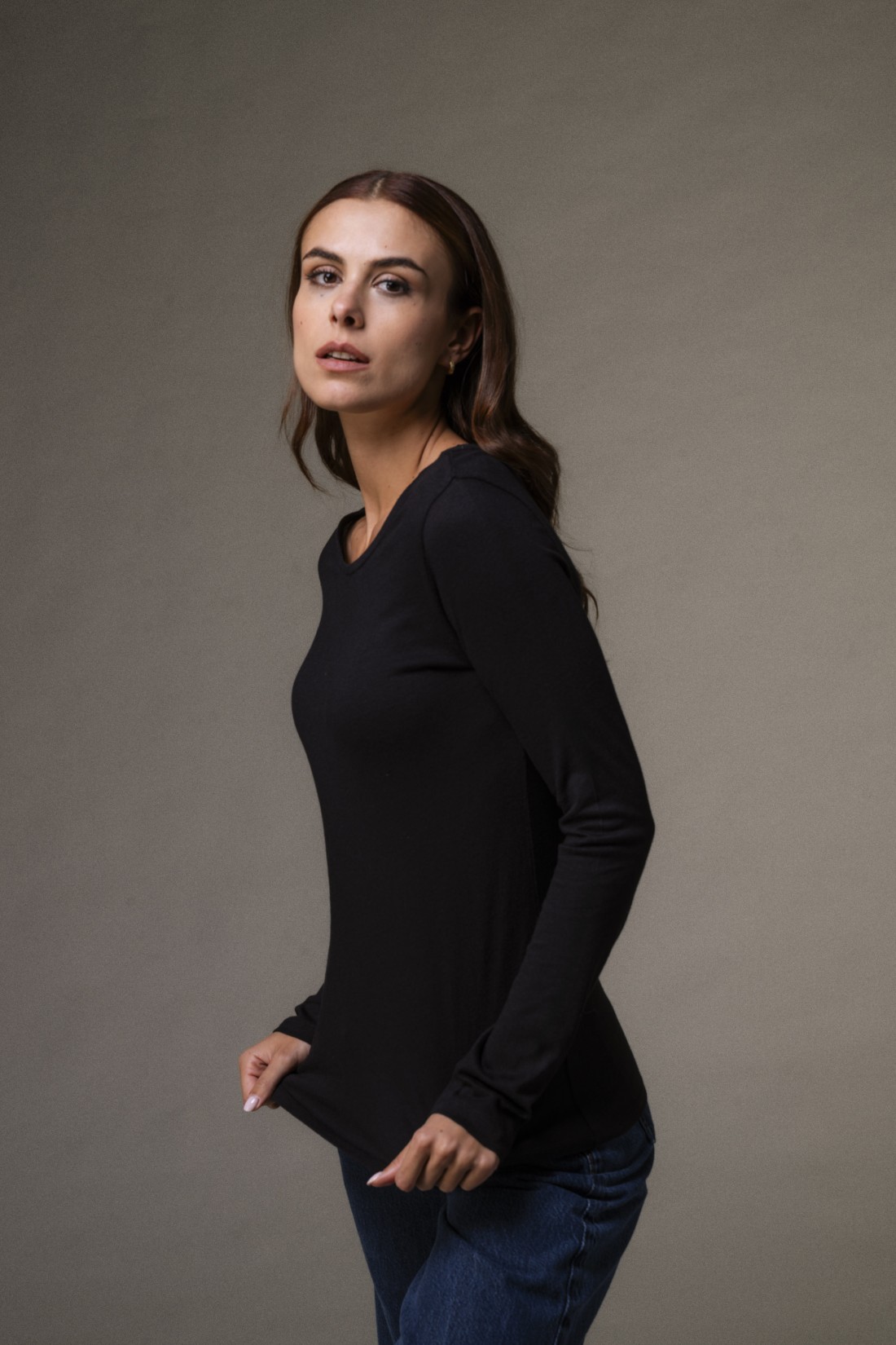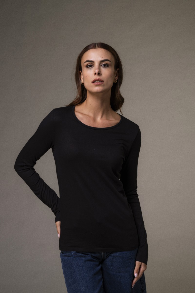 T-shirt girocollo con manica lunga e vestibilità slim: un capo passepartout, semplice ed elegante. La composizione di cotone e cashmere la rende particolarmente lussuosa e morbida al tatto, perfetta per essere abbinata ad altri capi oppure indossata da sola per un look essenziale.