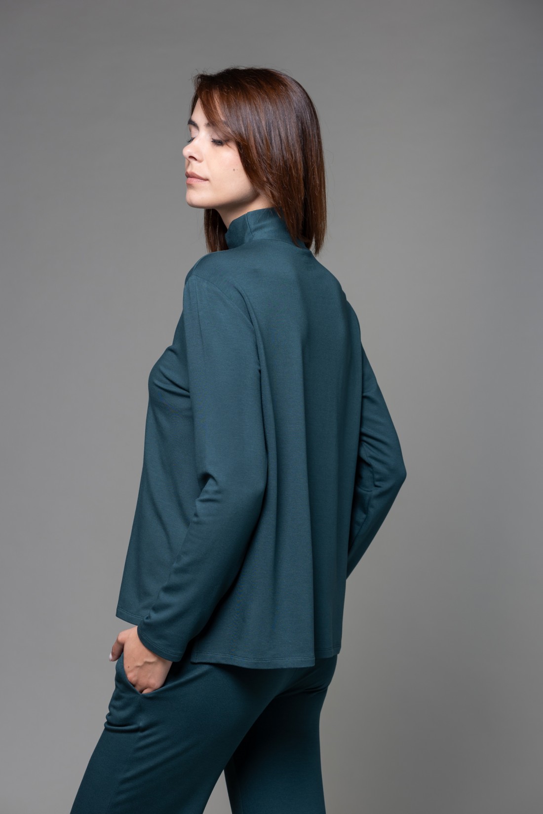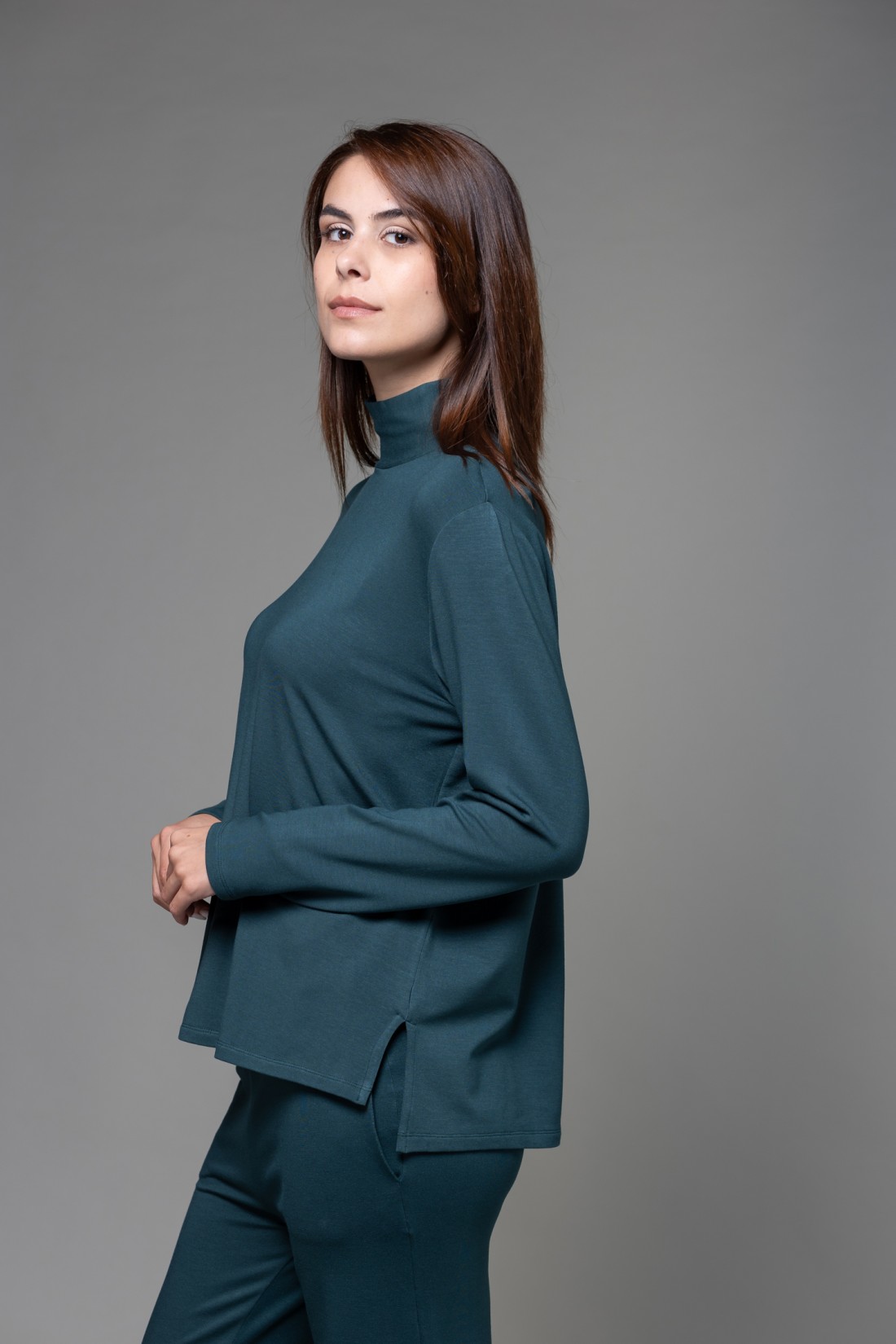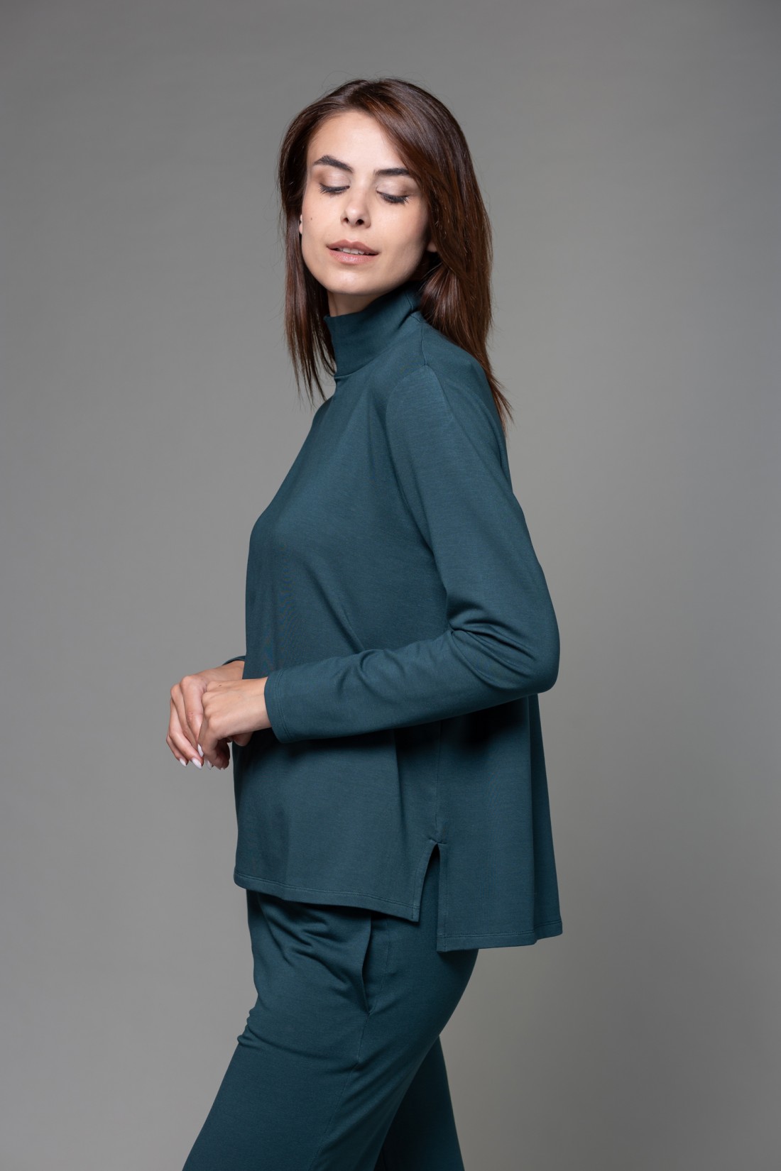 T-shirt felpata con collo alto e manica lunga, spacchetti laterali e vestibilità over: un capo versatile e moderno, perfetto sia per look eleganti che per look essenziali. La composizione di viscosa ed elastan la rende particolarmente avvolgente e morbida al tatto.