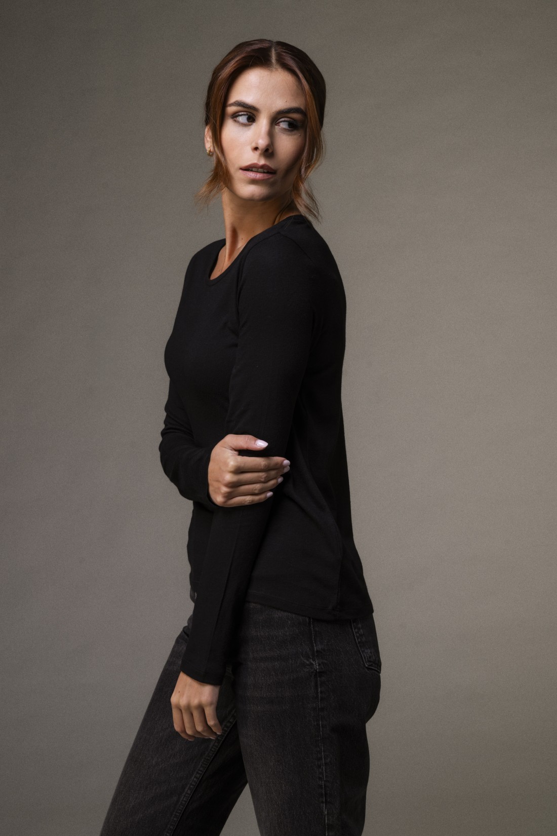 T-shirt girocollo con manica lunga e vestibilità slim: un capo passepartout, semplice ed elegante. La composizione di cotone e cashmere la rende particolarmente lussuosa e morbida al tatto, perfetta per essere abbinata ad altri capi oppure indossata da sola per un look essenziale.