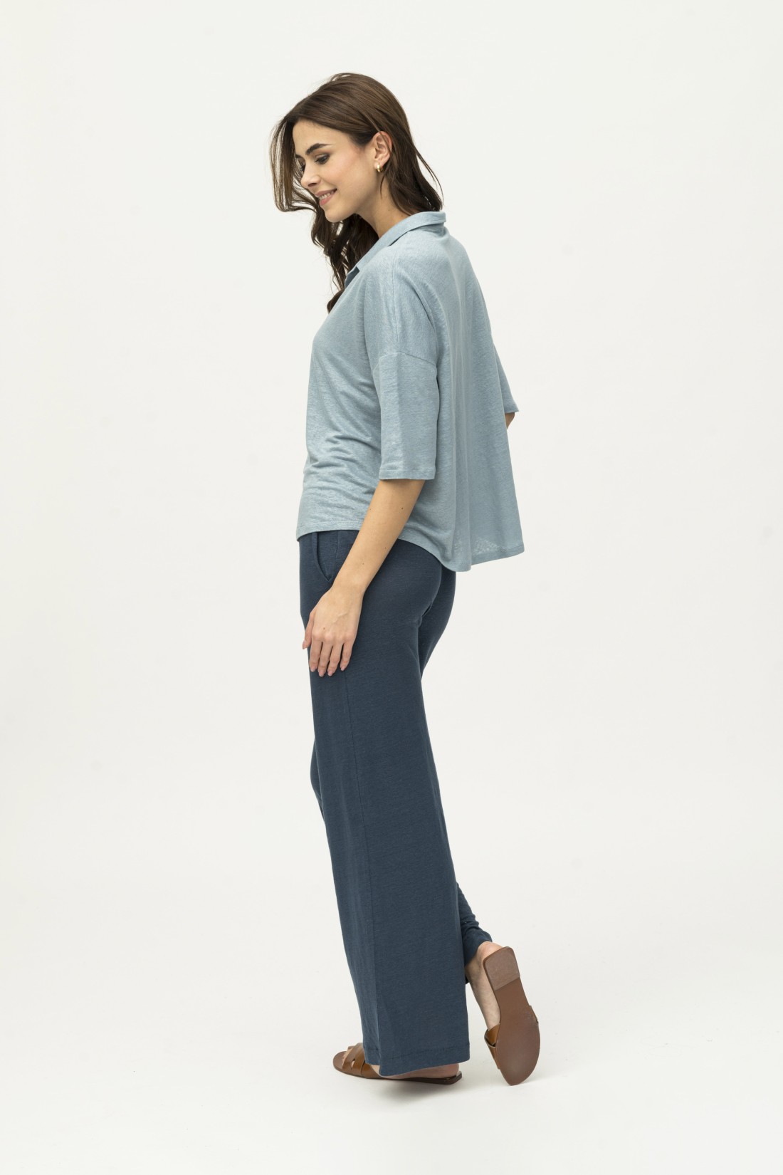 Pantalone in lino a fondo ampio, caratterizzato da una vestibilità leggera e comoda. Il tessuto traspirante e fresco lo rende ideale per le giornate calde, mentre la silhouette a gamba larga conferisce un look elegante e rilassato. Perfetto per un outfit casual-chic, adatto a diverse occasioni estive.
