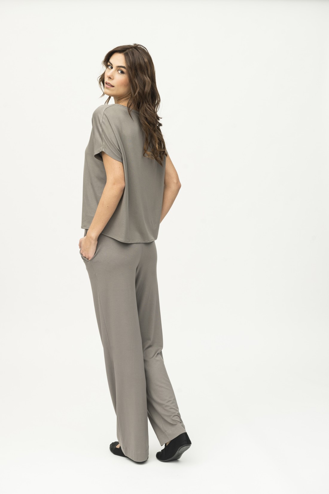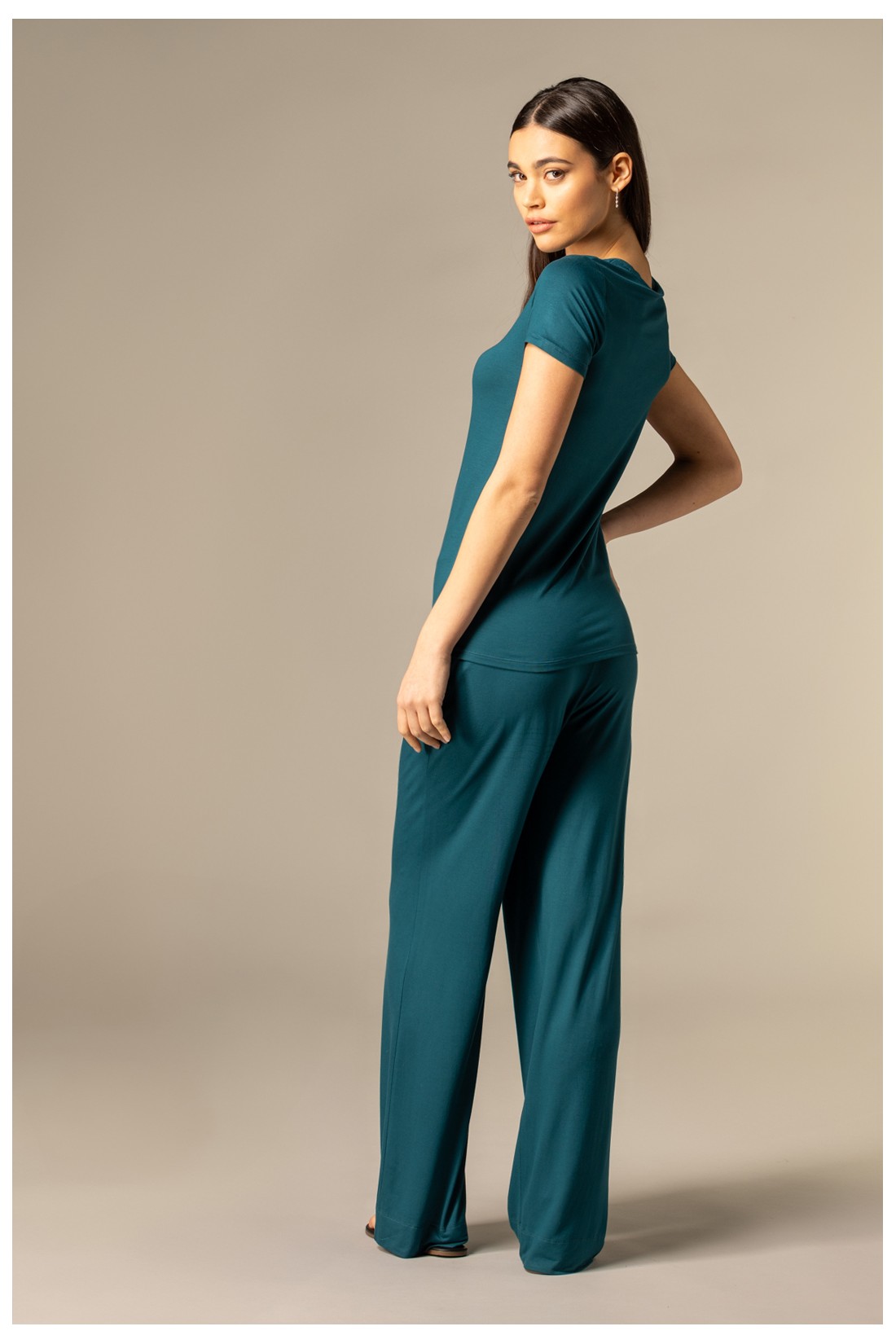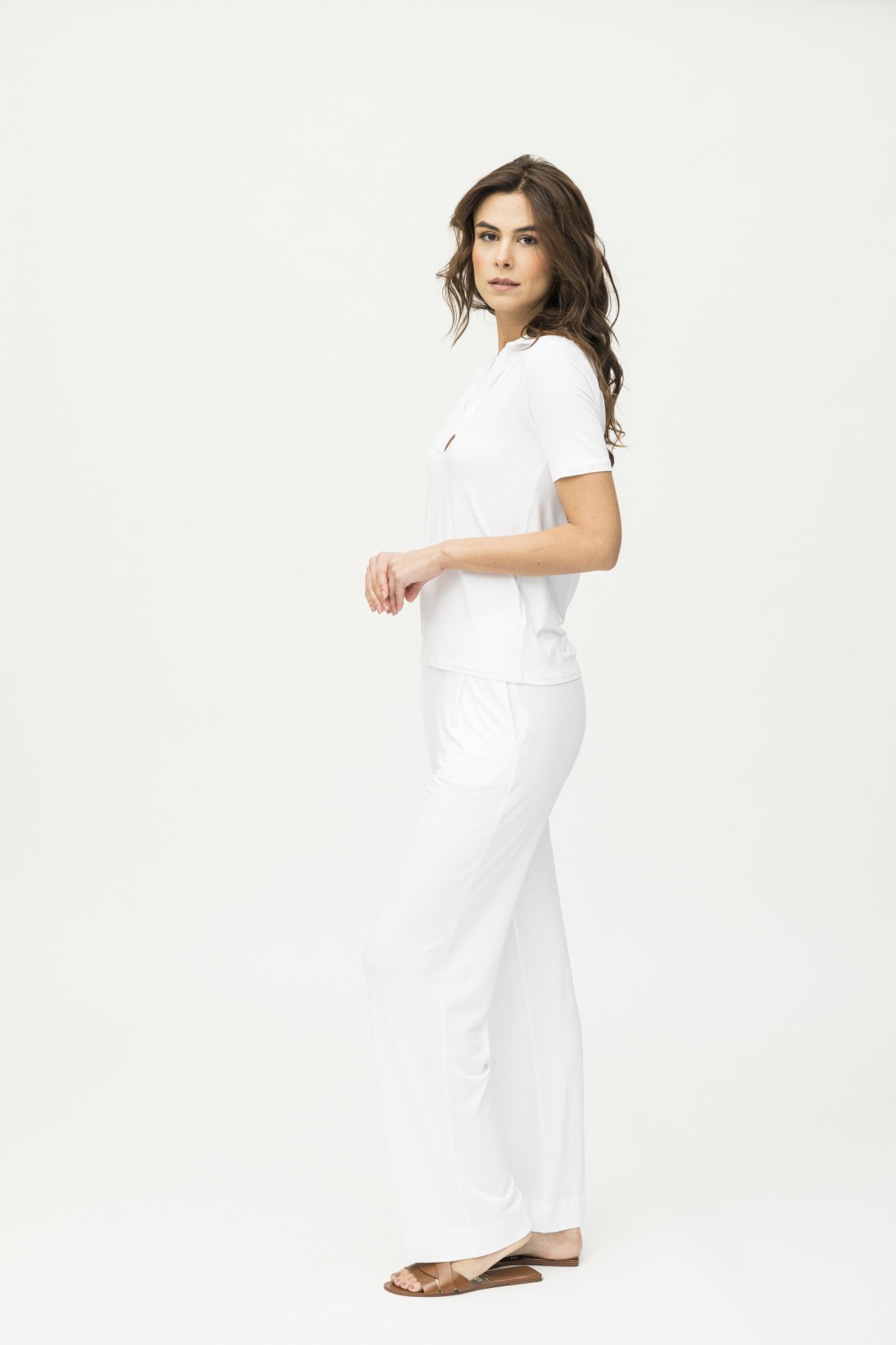 Pantalone nero con fondo ampio, pinces e vestibilità regolare: un capo pratico e moderno, perfetto per la vita di tutti i giorni. La composizione di viscosa ed elastan li rende particolarmente leggeri e morbidi al tatto.