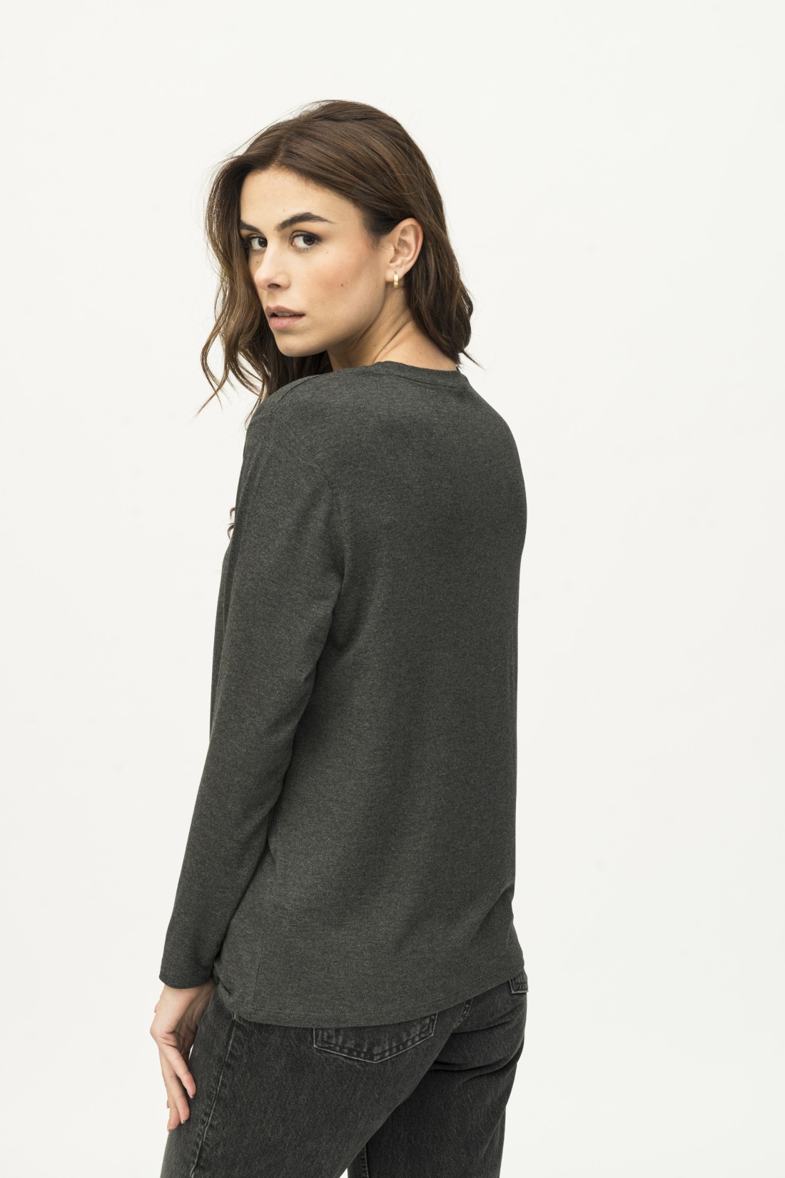 T-shirt girocollo manica lunga, vestibilità over: un capo versatile e femminile, semplice ed elegante. La composizione di viscosa ed elastan ne esalta la leggerezza e morbidezza al tatto. Le forme semplici e le linee morbide permettono a questa maglia di essere abbinata ad altri capi oppure indossata da sola per un look essenziale.