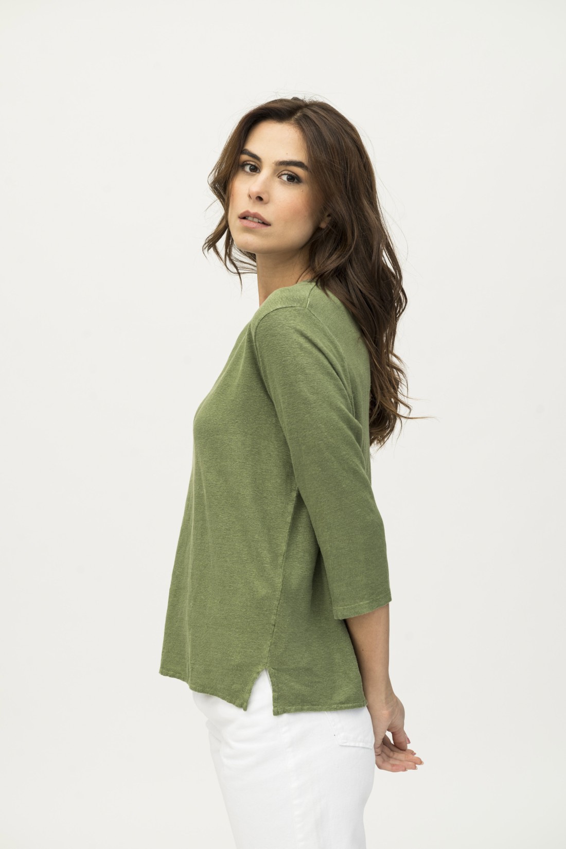 T-shirt maniche 3/4 in lino tinto in capo