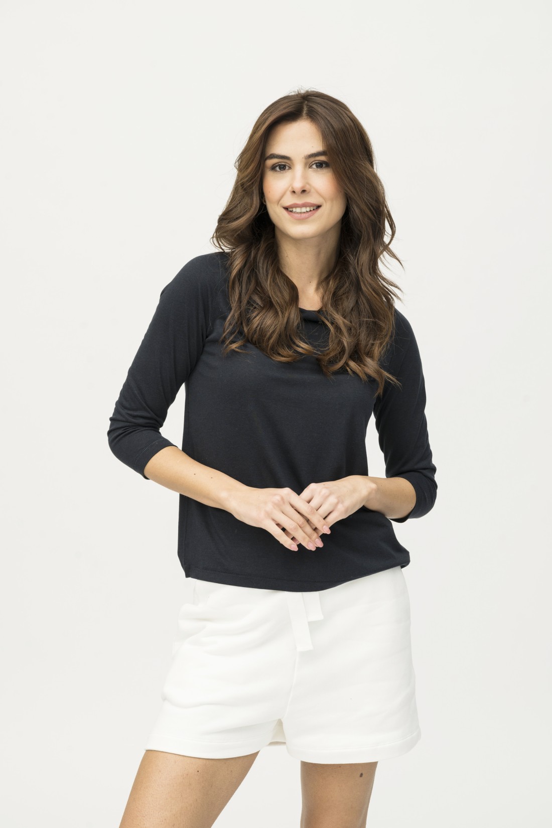 T-shirt a manica 3/4, scollo a barca e vestibilità regular: un capo passepartout, semplice ed elegante. La composizione di lyocell e cotone la rende particolarmente lussuosa e morbida al tatto, perfetta per essere abbinata ad altri capi oppure indossata da sola per un look essenziale.