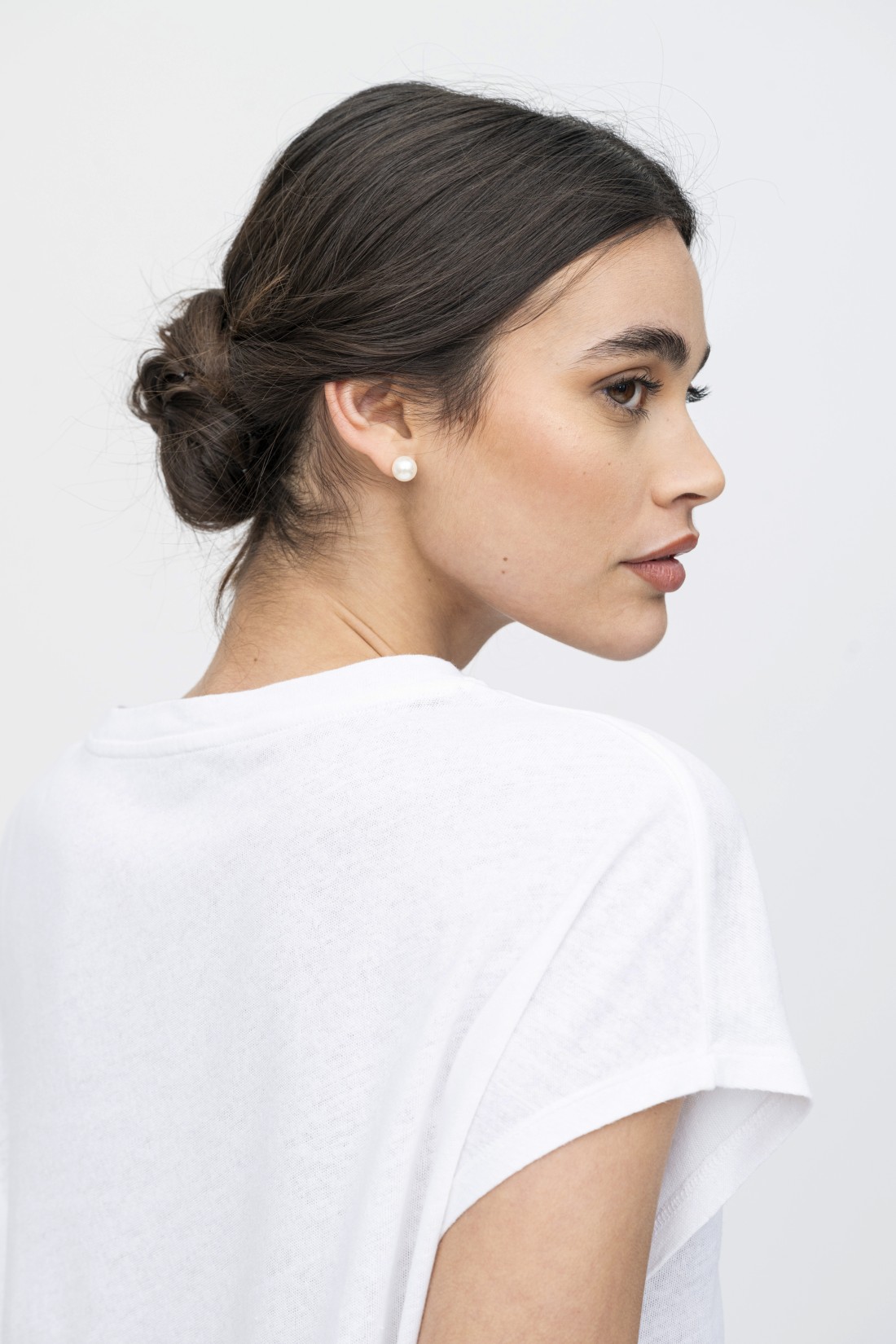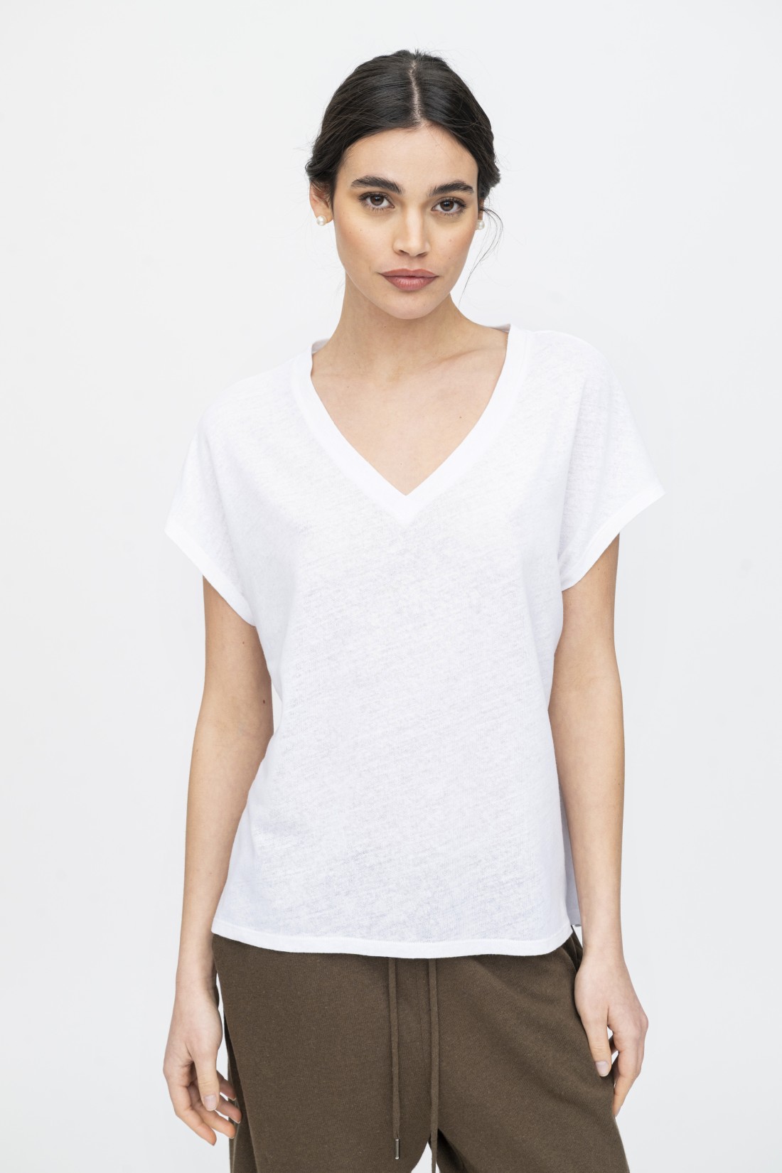 T-shirt maniche corte, spalla scesa e scollo a V in lino e cotone e vestibilità over: un capo passepartout elegante e raffinato. La combinazione di due tessuti lo rende lussuoso e particolarmente morbido al tatto, perfetto sia per look ricercati che per look essenziali.